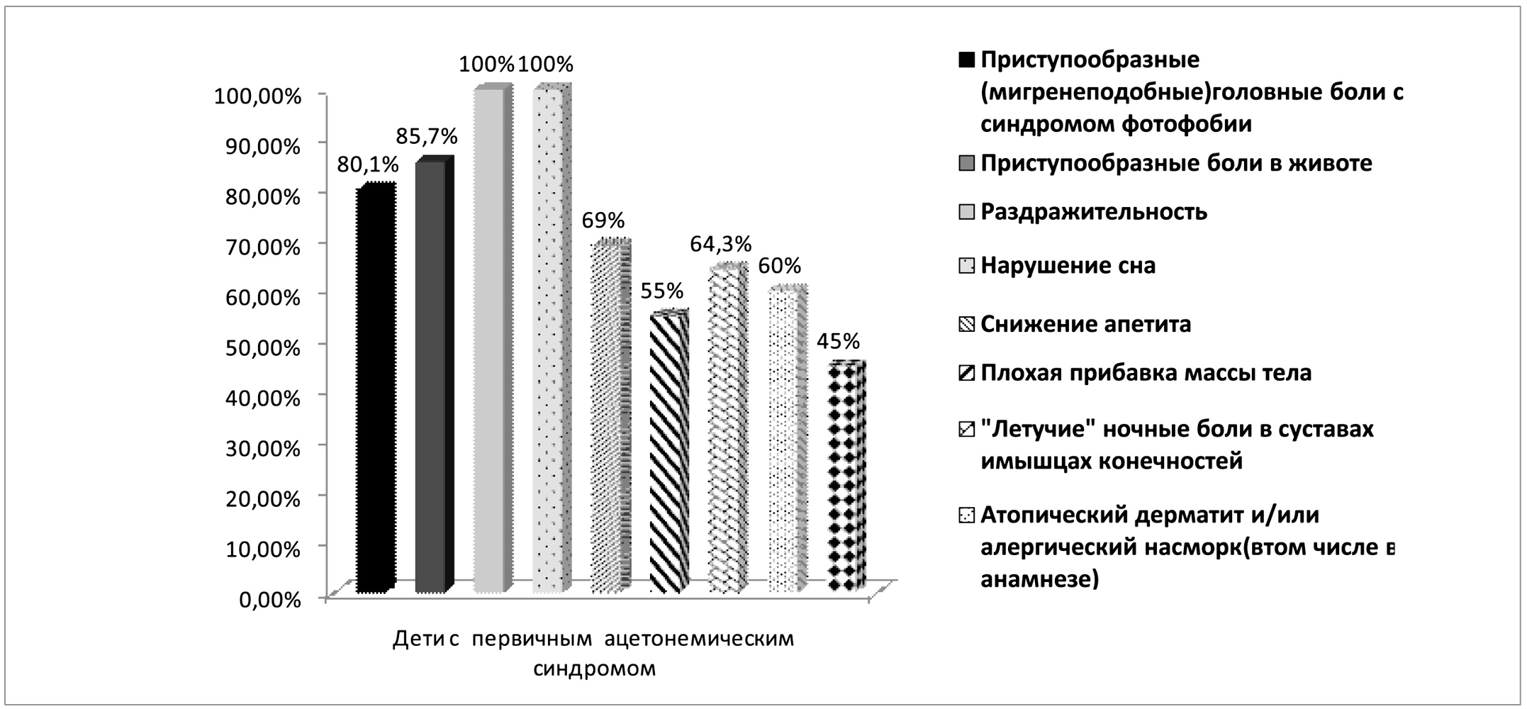 По нашим данным, наличие тех или иных указанных проявлений внеприступного периода и особенностей анамнеза, в том числе семейного, отмечено у всех пациентов с первичным ацетонемическим синдромом. Причем более чем у 80% детей зарегистрировано сочетание «факторов риска» по трем и более позициям, а у одной трети пациентов выявлена их 100% комбинация.