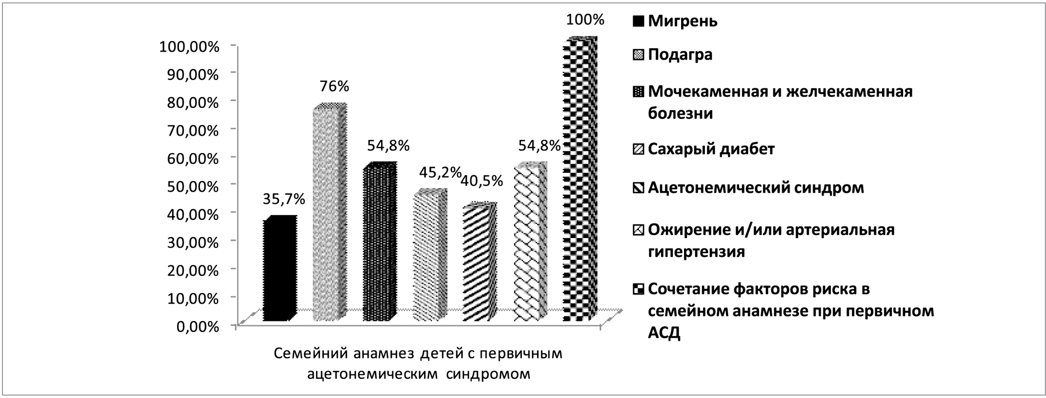 Рис. 3. Особенности семейного анамнеза детей с первичным ацетонемическим синдромом (% встречаемости у членов семьи)