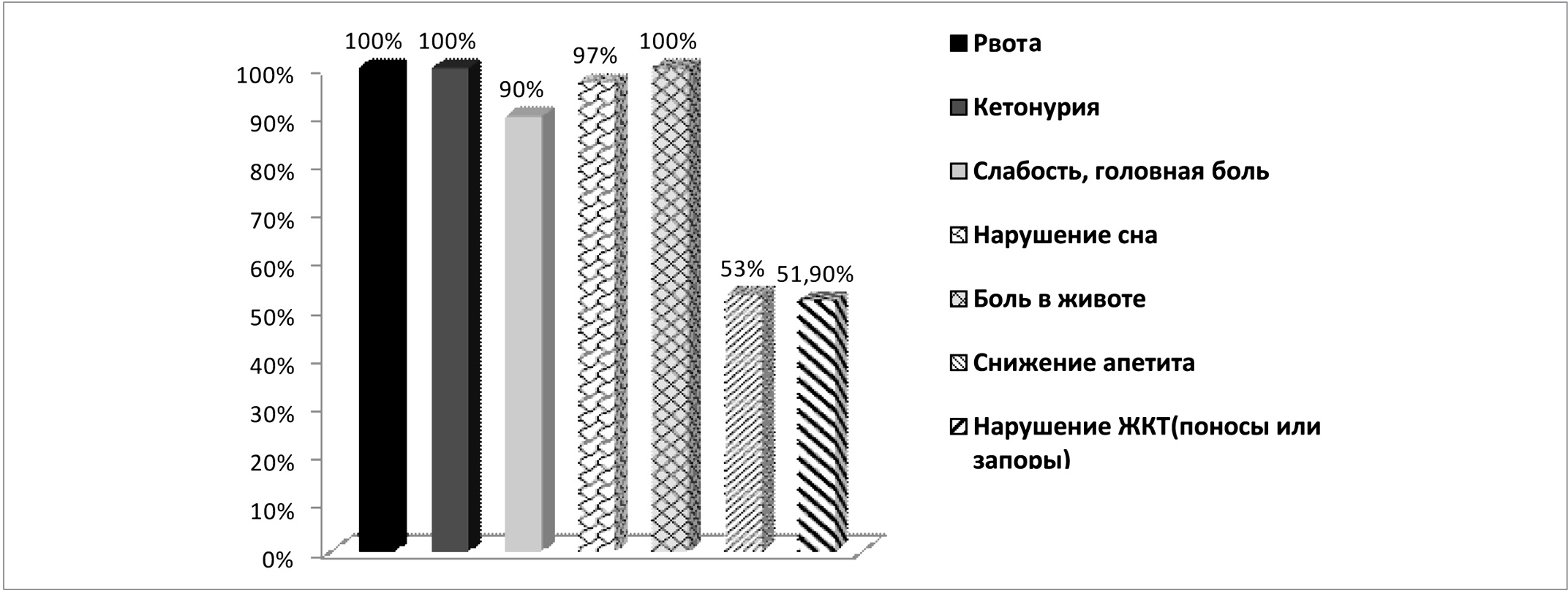 У детей при первичном ацетонемическом синдроме отмечалась цикличность рвоты с удовлетворительными межприступными периодами. У 34 пациентов 1 и 2 групп с первичным АСД (80%) преобладали приступообразные мигренеподобные головные боли, причем возраст у этих пациентов был старше 9 лет. У этих же детей были эпизоды пароксизмальной вегетативной недостаточности. Подробный анамнестический спектр жалоб и особенности симптомов внеприступного периода у пациентов при первичном АСД (CVS) представлены на рисунке 2.