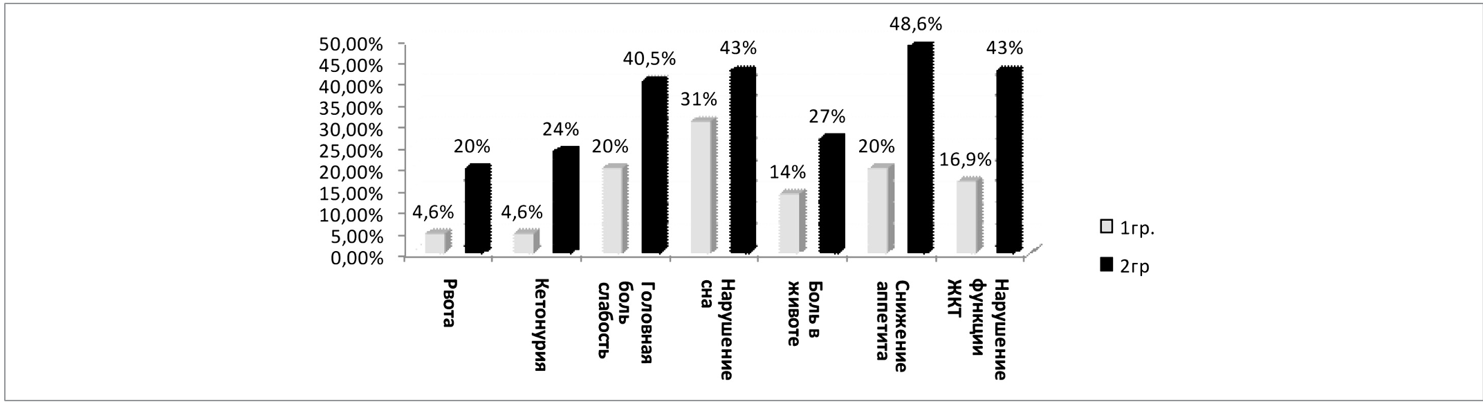 Вторичный АСД был зарегистрирован у 60 детей 1 и 2 групп с нечастыми (отсутствие цикличности) или одноразовими эпизодами ацетонемической рвоты. Этот синдром возникал на фоне: ОРВИ с гипертермическим синдромом, при дебюте вирусной диареи; функциональной диспепсии, ДЖВП, при проведении дегельминтизации, при пищевых аллергических реакциях. В таких случаях АСД определялся основным заболеванием, на которое наслаивалась кетонемия.