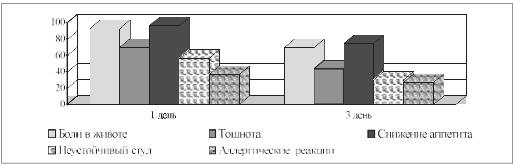 Наиболее выраженный терапевтический эффект наблюдался у больных токсидермией. Эту группу составили пациенты, страдающие алиментарной, реже медикаментозной токсидермией легкой и средней степени тяжести. Регресс высыпания отмечался на 2–3-и сутки, что было на двое суток раньше, нежели у пациентов группы сравнения.
