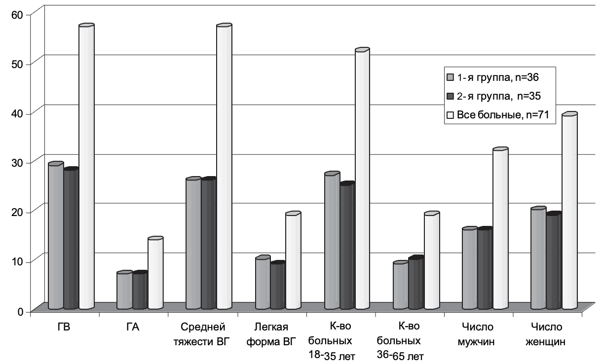 Больные 1-й группы (36 человек) получали лечение Атоксилом. Больные 2-й группы (35 человек) получали только базисную терапию. Общая характеристика групп больных представлена на Рис. 1.