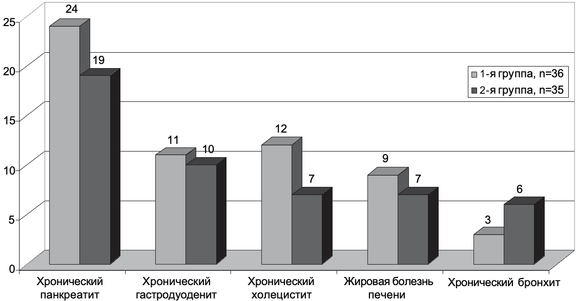 Как видно по данным, приведенным на Рис. 1, по основным параметрам – полу, возрасту, тяжести течения ВГ и его этиологии группы больных были сопоставимы. Наиболее частым сопутствующим заболеванием были хронический панкреатит у 43 (60,6%), обострение хронического гастродуоденита – у 21 (29,6%), холецистита – у 19 (26,8%), жировая болезнь печени в виде неалкогольного и алкогольного стеатогепатита – у 16 (22,5%), хронический бронхит – у 9 (14,6%). На Рис. 2 представлена характеристика групп больных в зависимости от характера сопутствующей патологии, которая чаще всего встречалась на фоне ВГ.