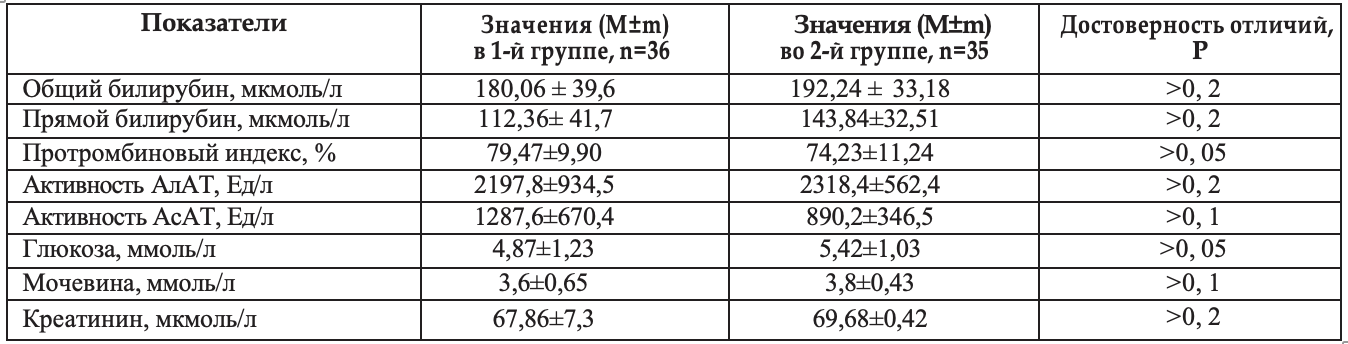 Основные анализируемые биохимические показатели крови до начала болезни в обеих группах достоверно не отличались (Таблица 4), поэтому анализ показателей проведен нами после 2-х недель лечения Атоксилом.