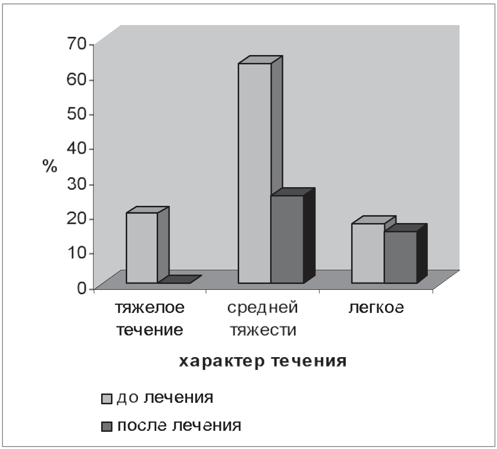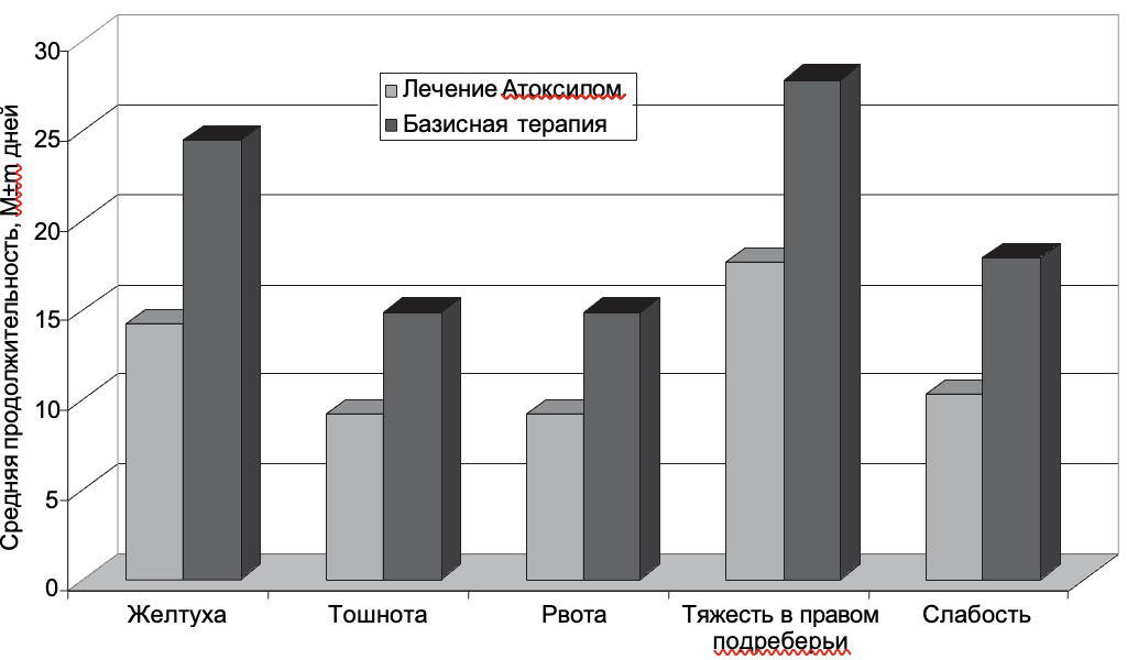 В обеих группах анализировали продолжительность симптомов болезни. Соответствующие данные представлены в Таблице 3. Как свидетельствуют данные, приведенные в таблице 3, лечение Атоксилом достоверно (Р<0,05) сокращало длительность желтухи, тяжести в правом подреберье, тошноты, рвоты, общей слабости, подтверждая тем самым свое выраженное дезинтоксикационное действие. Соответствующие данные приведены на Рис. 3.