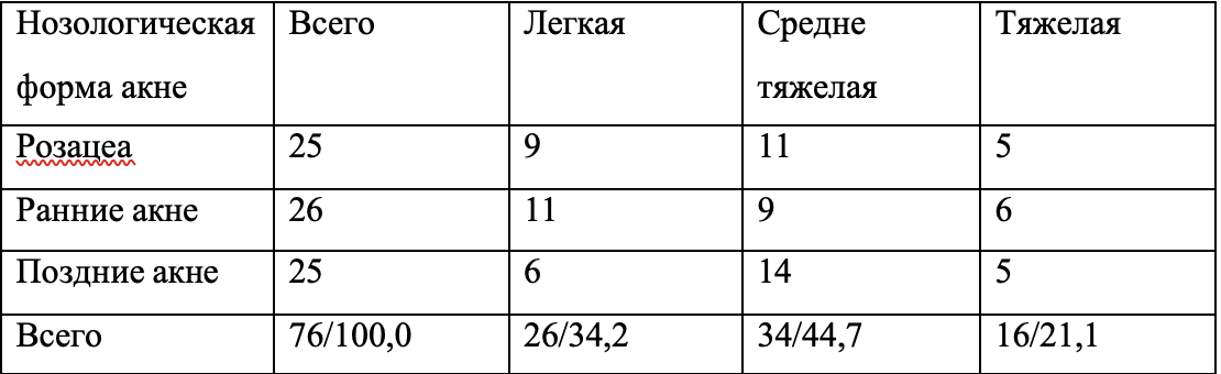 Легкая степень акне была у 26 (34,2%), средне-тяжелая – у 34 (44,7%), тяжелая – у 16 (21,1%) больных (табл.2). Обращало внимание, что среднетяжелое и тяжелоеакне было у 15 (57,7%) больных ранними акне, у 19 (76%) больных поздними акне и у 16 (64%) больных с розацеа, т.е. при всех формах дерматоза преобладали пациенты с тяжелыми формами заболевания.