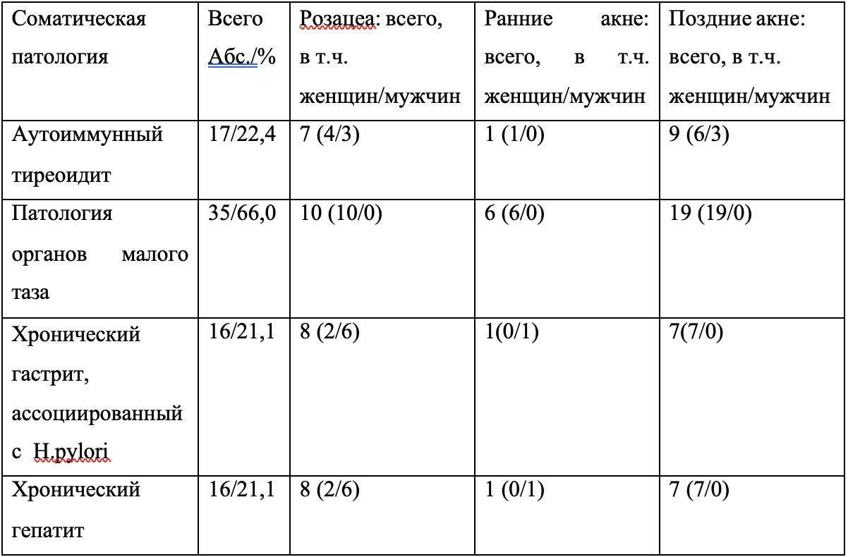 Таблица 3. Патогенетически значимая соматическая патология у больных различными формами акне
