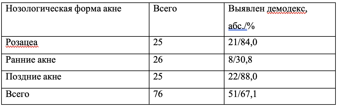 Таблица 4. Выявляемость демодекса при различных формах акне