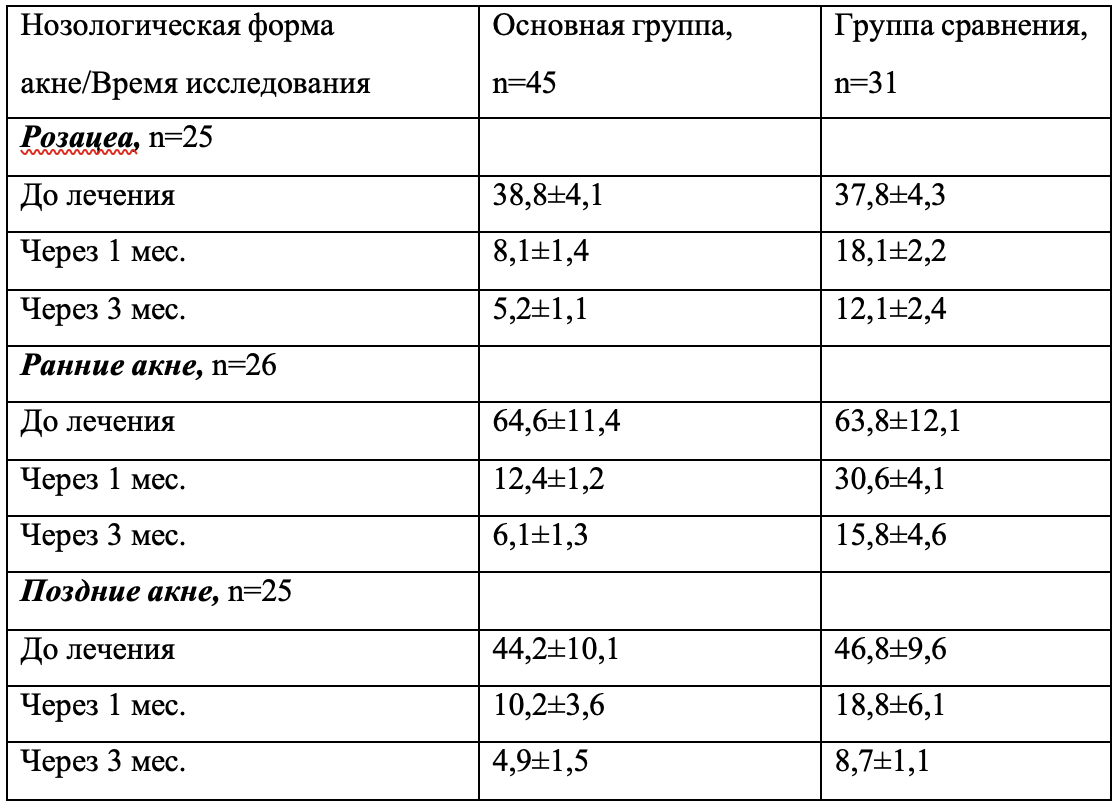 Так, снижение индекса ОУН при ранних акне через 1 мес было почти в 5 раз в основной группе – с 64,6±11,4 до 12,4±1,2 и лишь в 2 раза – в группе сравнения – с 63,8±12,4 до 30,6±4,1; при поздних акне – с 44,2±10,1 до 10,2±3,6 в основной группе и лишь с 46,8±9,6 до 18,8±6,1 – в группе сравнения; при розацеа – в основной группе – с 38,8±4,1 до 8,1±1,4, в то время как в группе сравнения – с 37,8±4,3 до 18,1±2,2. Особое внимание привлекал тот факт, что через 3 месяца у больных основной группы при всех формах дерматоза индекс ОУН был почти в 2 раза ниже, чем в группе сравнения: при ранних акне – 6,1±1,3 и 15,8±4,6 соответственно; при поздних акне – 4,9±1,5 и 8,7±1,1 соответственно; при розацеа – 5,2±1,1 и 12,1±2,4 соответственно.