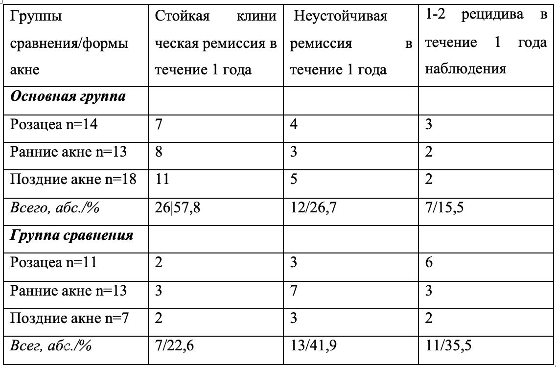 Таблица 6. Отдаленные результаты лечения больных различными формами акне