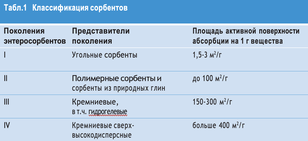 There is no clear classification of enterosorbents. From generation to generation, they are distinguished by more and more advanced and diverse adsorption properties, as well as additional, not only sorption, but also so-called mediated healing effects. From generation to generation, the active surface area of enterosorbents increases. Non-porous sorbents of the 4th generation have the maximum sorption area. At the same time, the entire surface area is active. Consequently, the daily dose of enterosorbents is reduced.