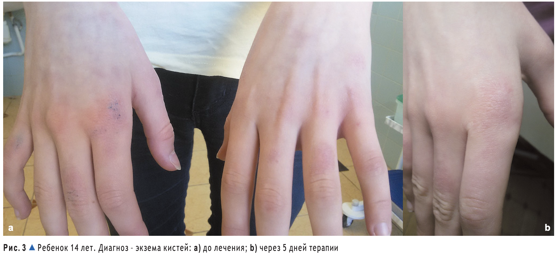 "Atoxyl" and "Eliminal Gel" were added to the complex traditional therapy, which included systemic and topical preparations. "Atoxyl" was prescribed 1 vial per day in 3 doses 1.5 hours before meals - 3 days, then "Elimin Gel" was prescribed - for 10 days 1.5 hours before meals, 1 stick 2 times a day for children under the age of 13, 1 stick 3 times a day for children aged 14–17 years. To objectively assess the severity of the disease before and after treatment, in children with atopic dermatitis and eczema, we used a quantitative assessment - the SCORAD coefficient (kS), which was calculated by estimating the area of skin damage (A); the degree of manifested (B) (erythema, formation of papules/vesicles, wetness, excoriations, lichenification, dry skin) and subjective (C) (itching of the skin and sleep disturbances) symptoms. With the maximum prevalence of the process and the manifestation of objective and subjective symptoms, SCORAD = 103, and with their complete absence, SCORAD = 0.