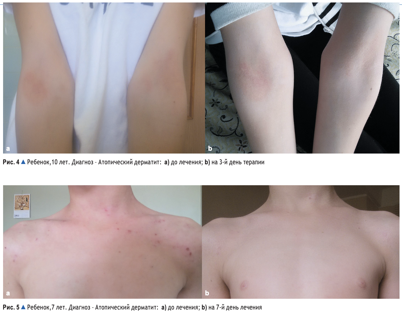 In children with atopic dermatitis and eczema, who received therapy with Atoxyl and Eliminal Gel, we noted positive dynamics in the clinical manifestations of the disease (Figs. 2–5). This occurred in the reduction of infiltration and hyperemia in the lesions, the involution of papular rashes and the shedding of crusts, the reduction of itching and the normalization of sleep, already in the first 3 days of using the drug. On average, the SCORAD coefficient was 35.57 ± 3.54 before treatment in observed children with manifestations of atopic dermatitis, a disease of mild and moderate severity. After 10-14 days of treatment, the SCORAD coefficient decreased on average to 10.61 ± 0.82. The pathological process was completely resolved during therapy in 14 of 15 children. In one child, we observed repeated exacerbation of the pathological process as a result of a gross violation of the hypoallergenic diet.